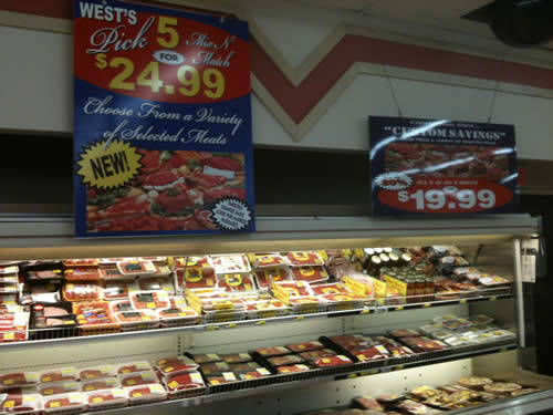 Look for extra savings in the Meat Department. One popular program is the "Pick 5 items for $19.99".